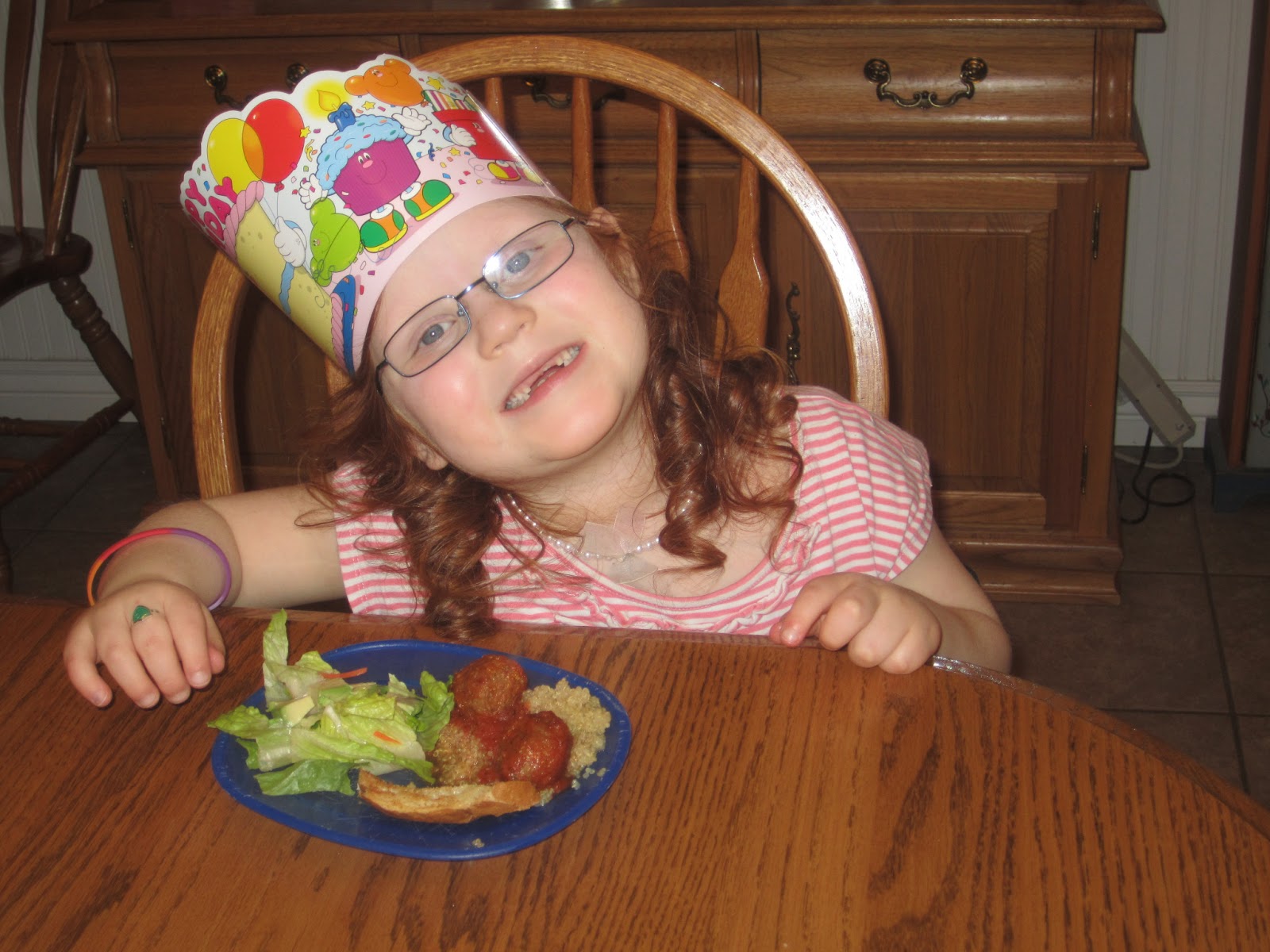 | For Savannah's birthday dinner we made one of her favorites! Quinoa with meatballs, salad, and garlic bread! |
